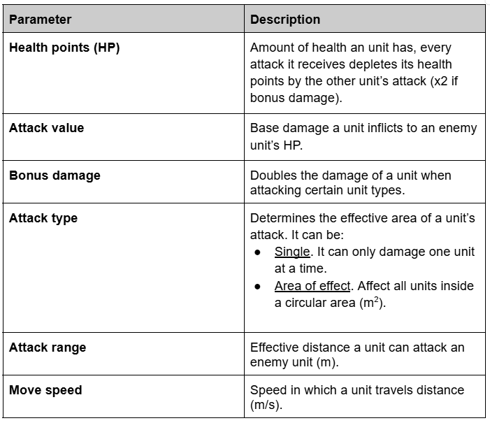 Other “hidden parameters” that units may have, like attack speed, size, acceleration, rotation speed, etc. are considered the same for each unit for simplification purposes. Units can’t attack while moving.