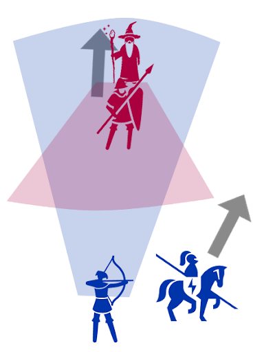 The blue player puts an archer, who has higher range than the sorcerer, to either attack it or bonus attack the spearman. The red player is forced to retreat and the horseman is sent to chase the less mobile sorcerer. If the spearman stays defending the sorcerer from the horseman, the archer will kill him. This leads to an interesting decision for the red player: to sacrifice one unit and save the other, to micro out play the blue player, to send reinforcements, etc.